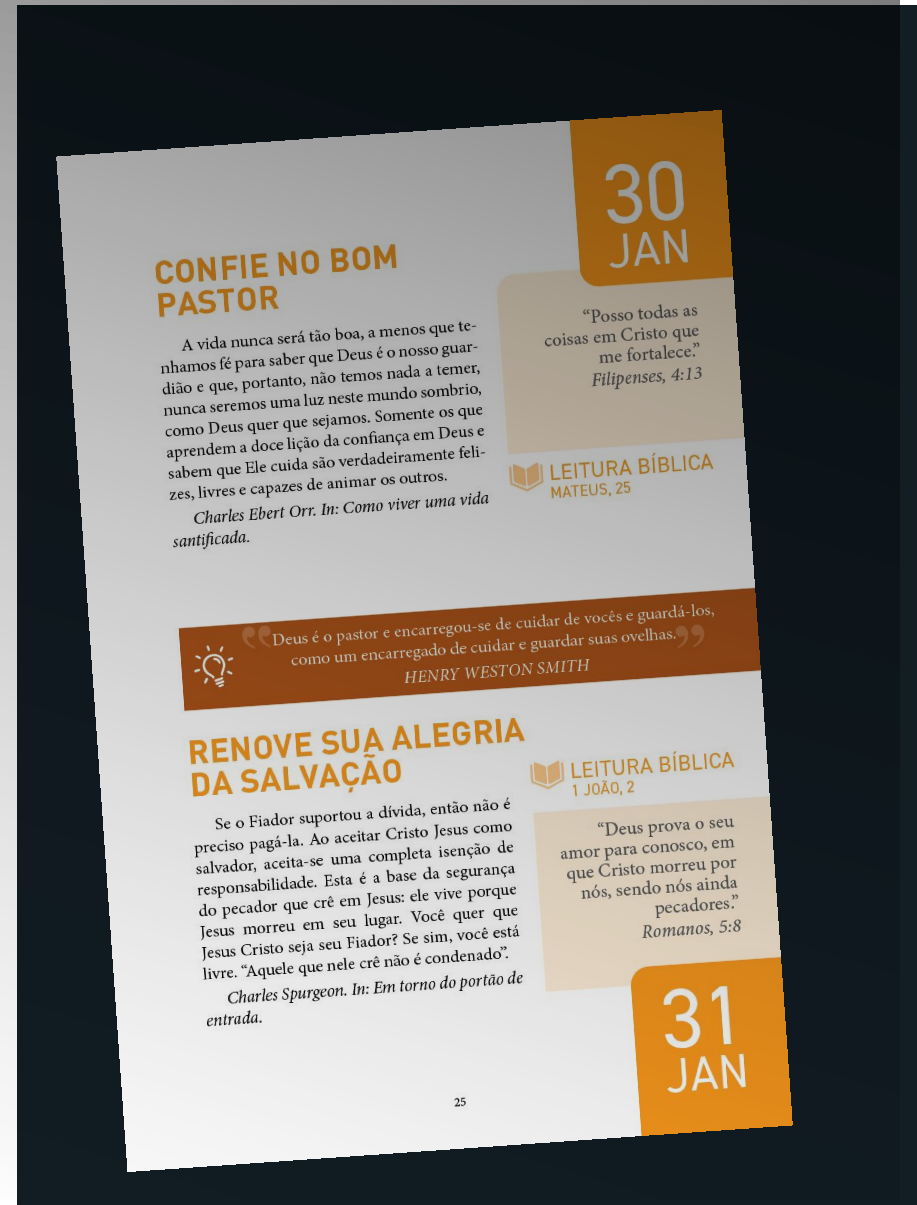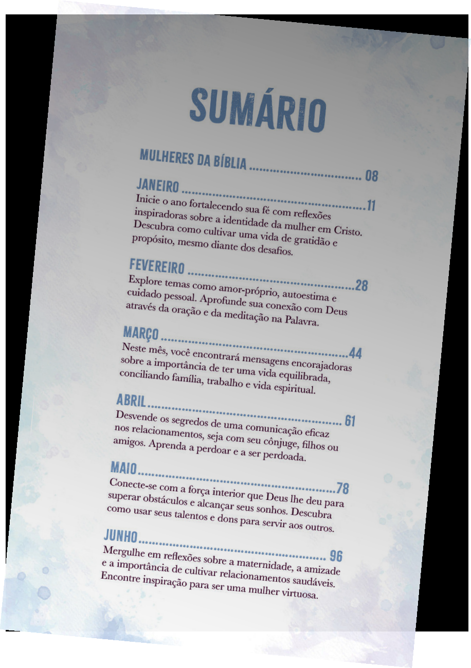 Em meio à correria e aos desafios da rotina, encontrar um momento de verdadeira paz e intimidade com Deus é essencial para não deixarmos nossa luz se apagar. Este devocional foi cuidadosamente preparado para ser o seu refúgio espiritual, um guia que caminha ao seu lado em cada uma das estações do seu ano.